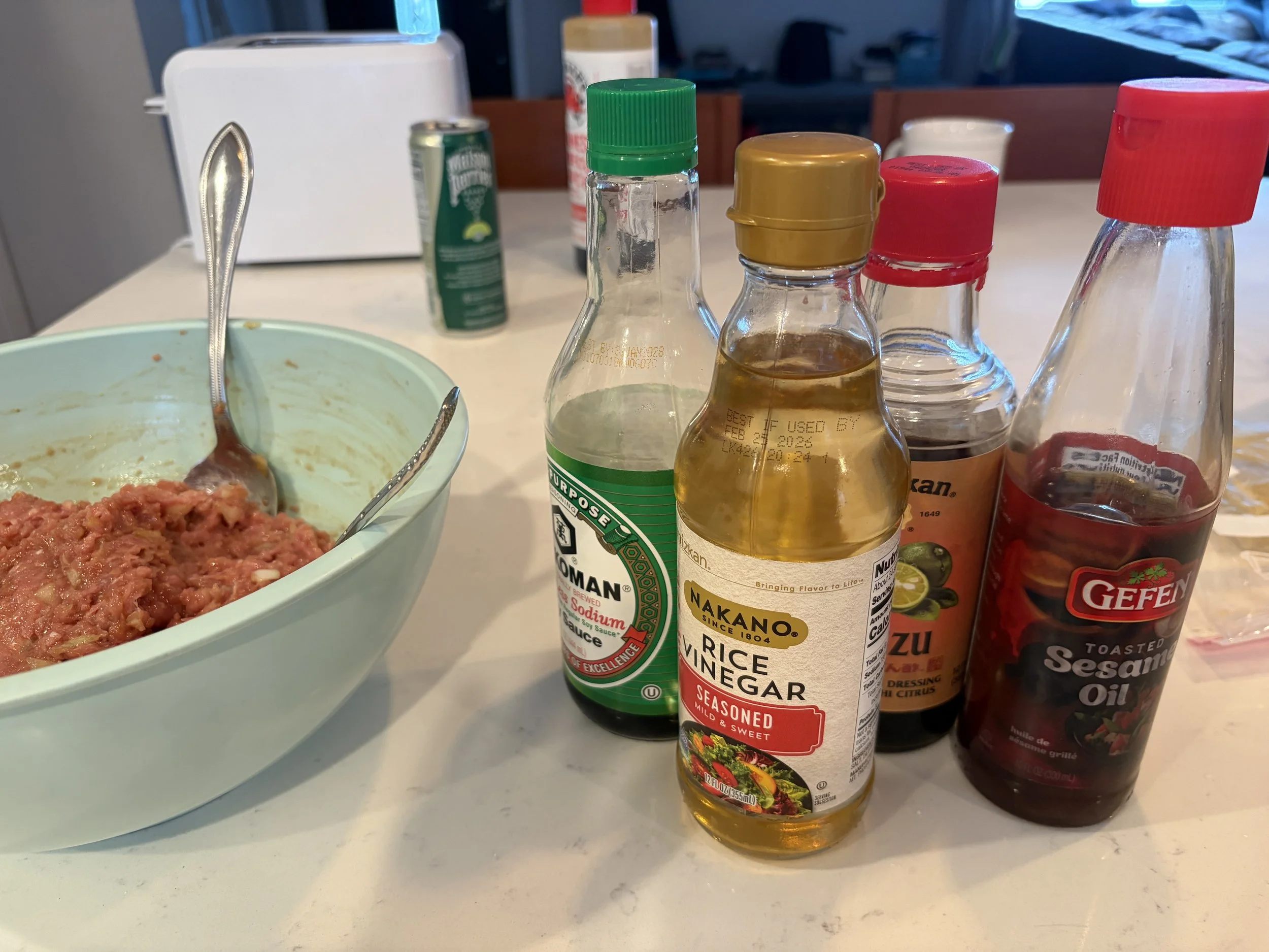 In a large bowl, combine the ground meat, garlic, ginger, scallions, soy sauce, rice wine vinegar, sesame oil, and ponzu sauce. Mix thoroughly until well combined.
