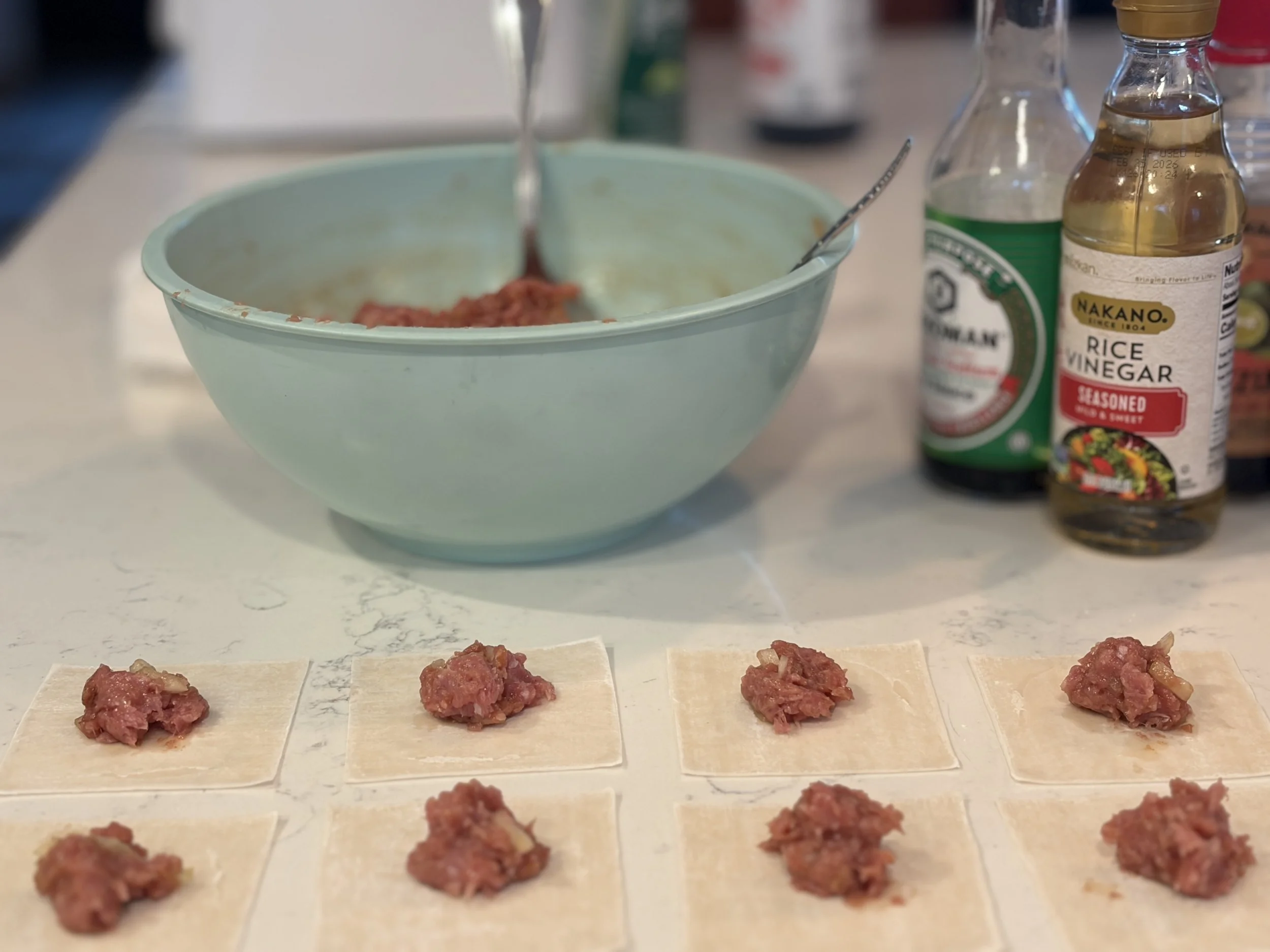 Place a small amount of the meat mixture in the center of each wrapper.